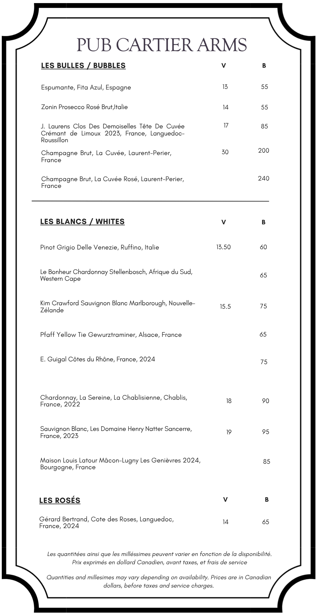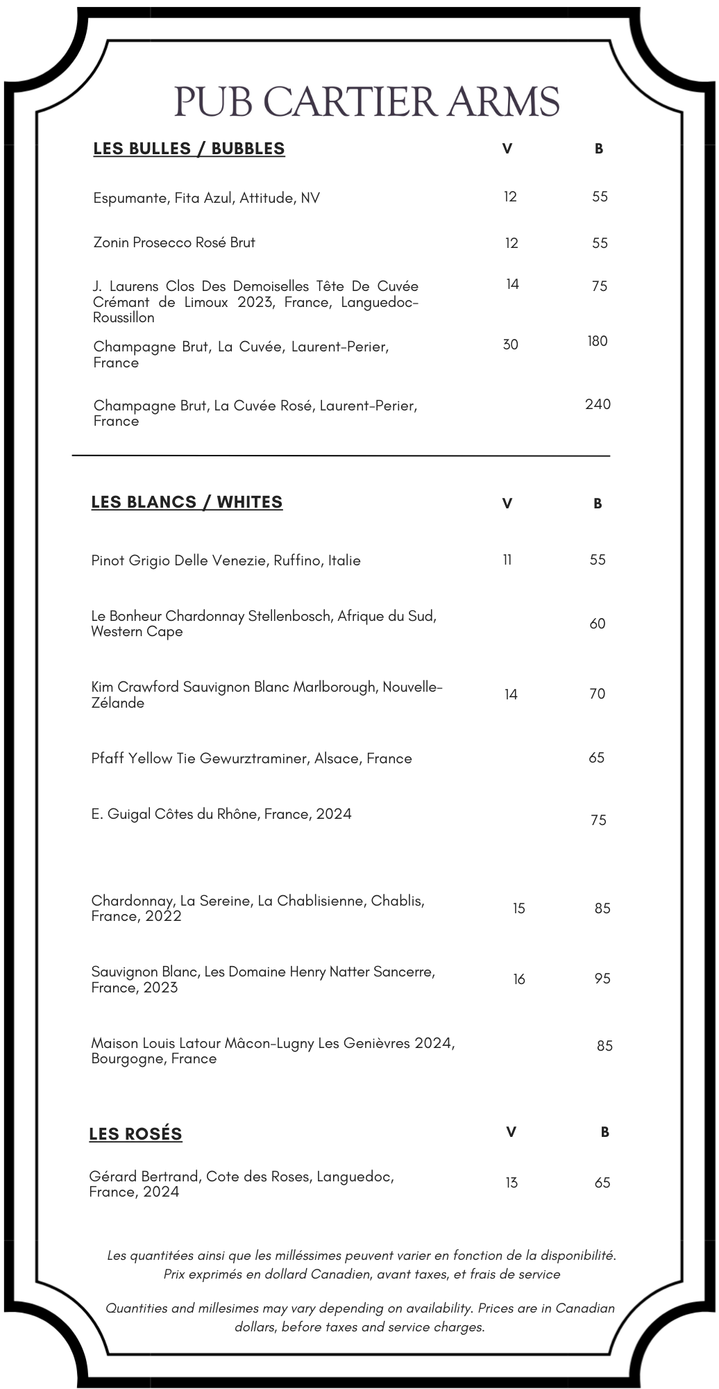 Cartier Arms Room ServicePlease dial Restaurant on your Guest Room phone Breakfast and Brunch Lunch and Dinner Kid’s menu & Desserts View fullsize View fullsize Drinks View fullsize View fullsize View fullsize Click the link to make a reservation at the restaurant Make a reservation