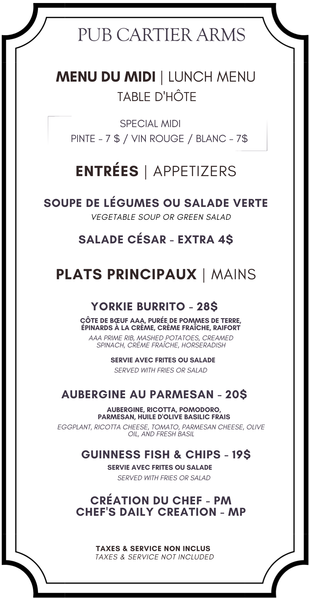 Cartier Arms Room ServicePlease dial Restaurant on your Guest Room phone Breakfast and Brunch Lunch and Dinner Kid’s menu & Desserts Drinks Click the link to make a reservation at the restaurant Make a reservation