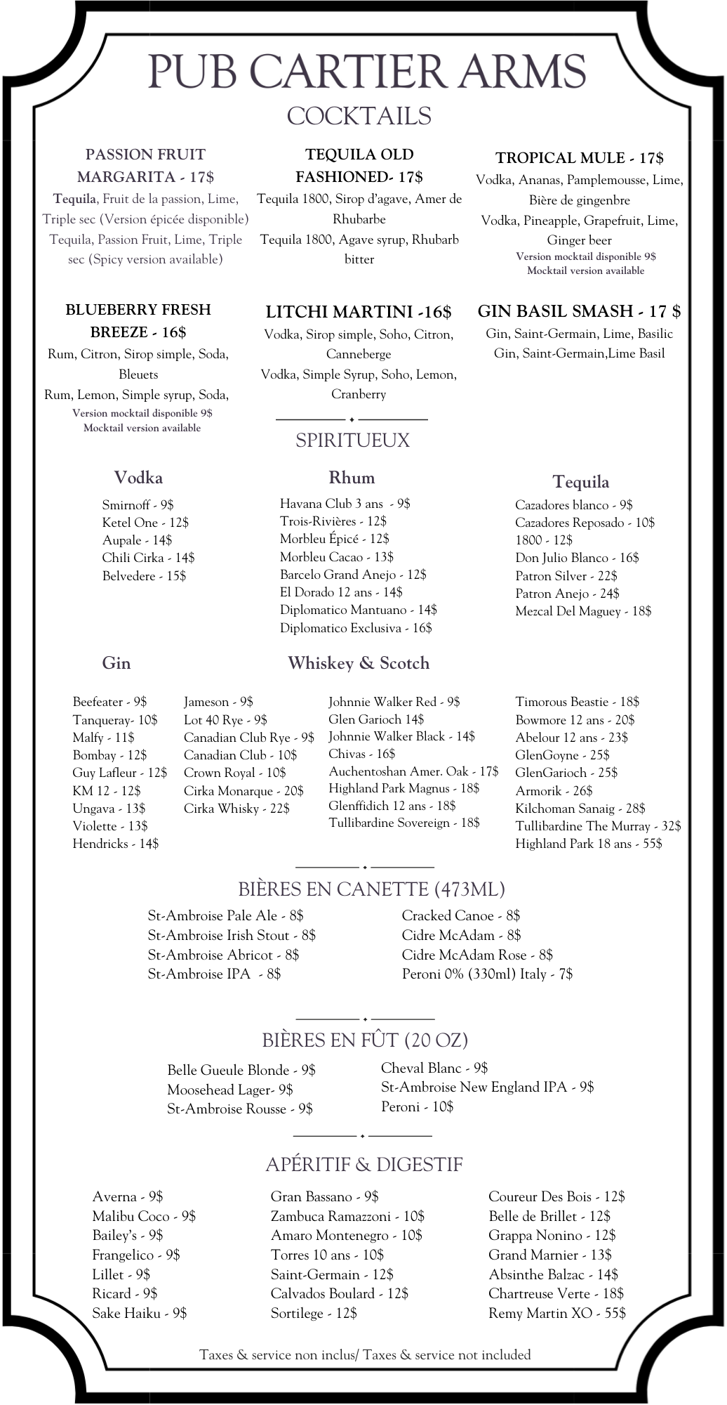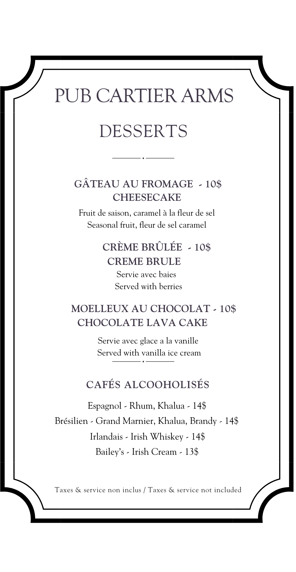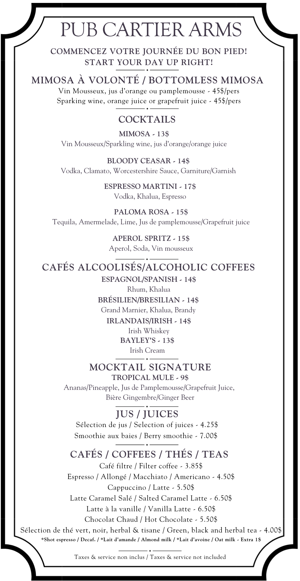 Cartier Arms Room ServicePlease dial Restaurant on your Guest Room phone Breakfast and Brunch Lunch and Dinner Kid’s menu & Desserts Drinks Click the link to make a reservation at the restaurant Make a reservation