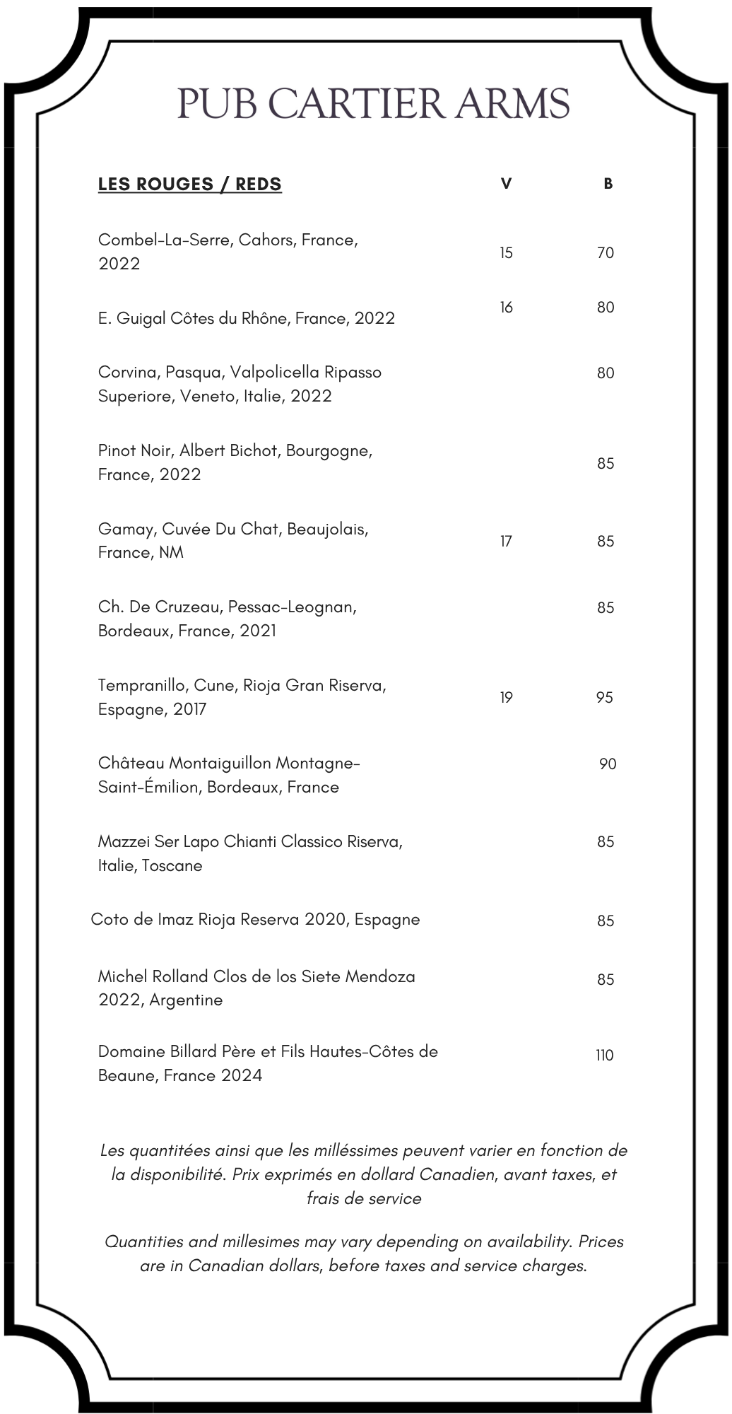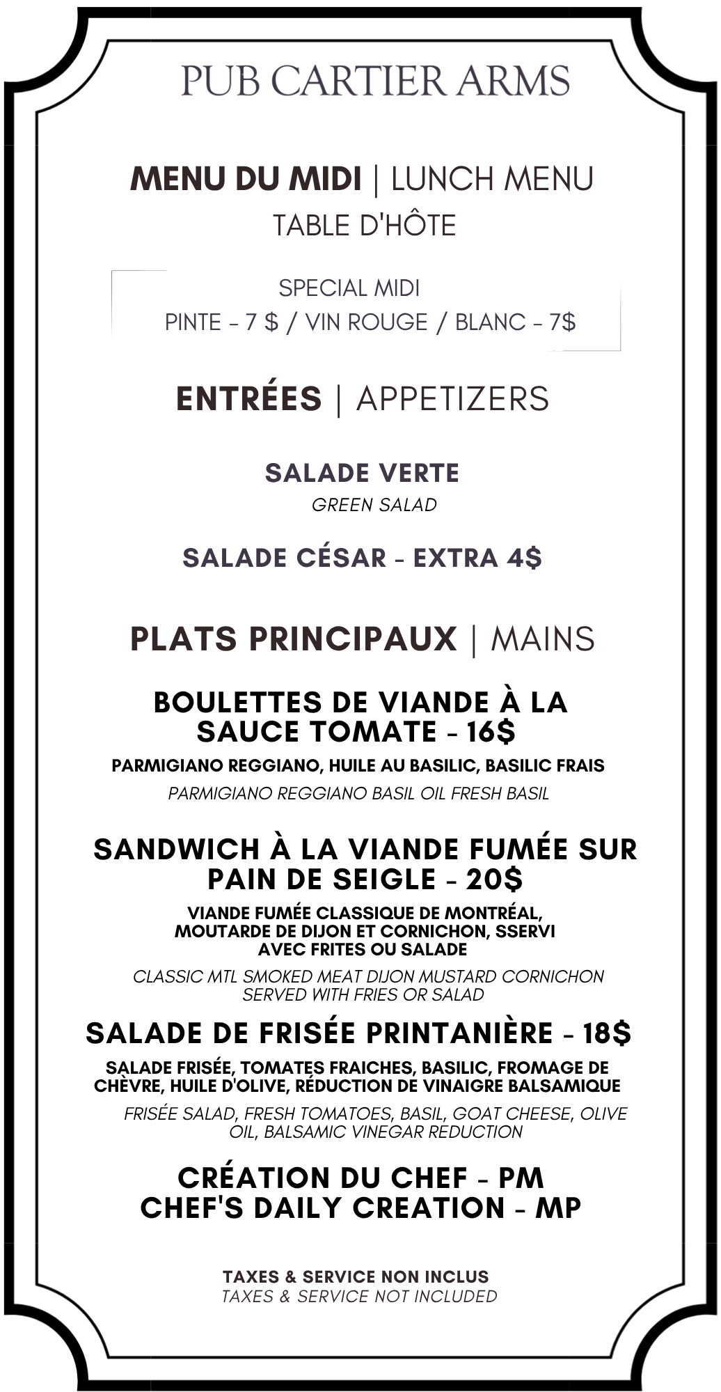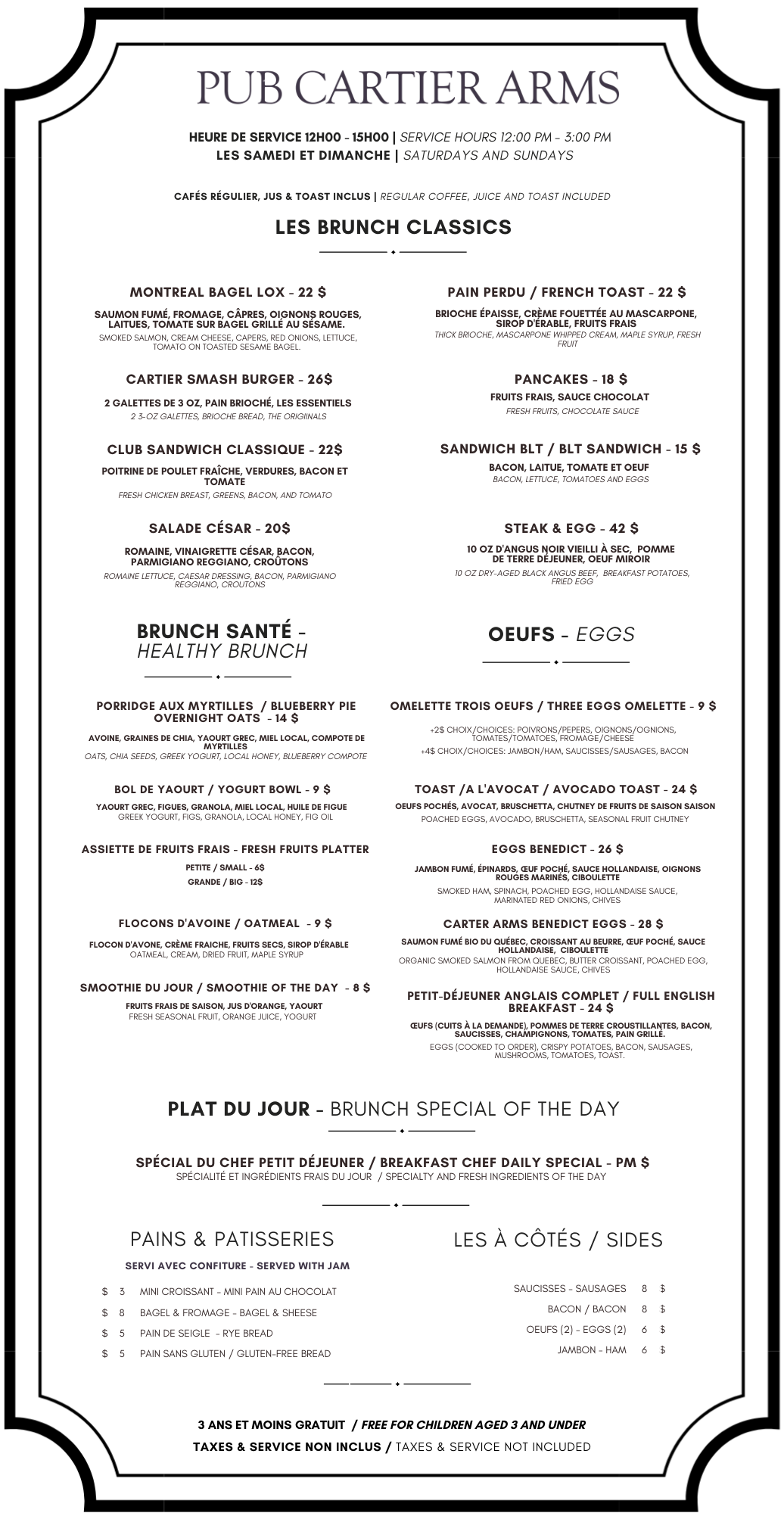 Cartier Arms Service au chambreVeuillez composer restaurant sur le téléphone de votre chambre View fullsize Petit Déjeuner et Brunch View fullsize Lunch et souper View fullsize View fullsize Menu d’Enfants & Desserts View fullsize View fullsize Breuvages View fullsize View fullsize View fullsize Cliquez sur le lien pour faire une réservation au restaurant Faire une réservation